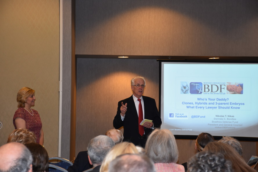 Co-founders Dorinda Bordlee and Nikolas Nikas of the nationally renowned Bioethics Defense Fund (BDF) gave a free presentation prior to the 2017 PLLDF Century Dinner.  PLLDF is happy to report that over 40 people attended this inspiring, educational event.  Attorneys Bordlee and Nikas presented on the critical and timely issues of “Natural law: Cloning, Chimeras, Animal-Human Hybrids, 3-Parent Embryos: What Everyone Should Know About The Brave New World.”  PLLDF is honored that the BDF enlightened us at this event.  We are continually grateful for the critical work that BDF, and pro-life organizations, contribute on a daily basis.